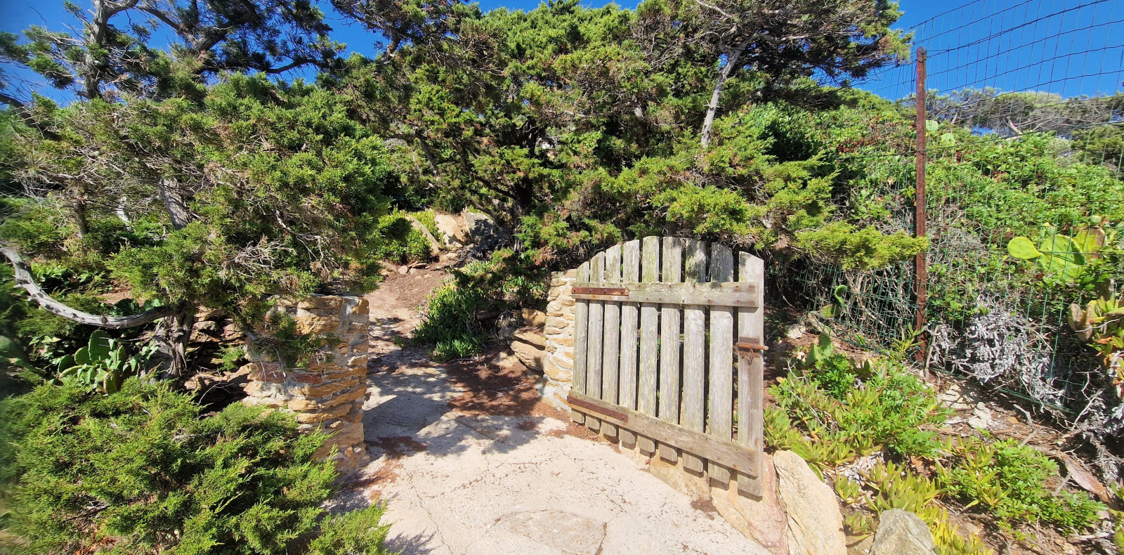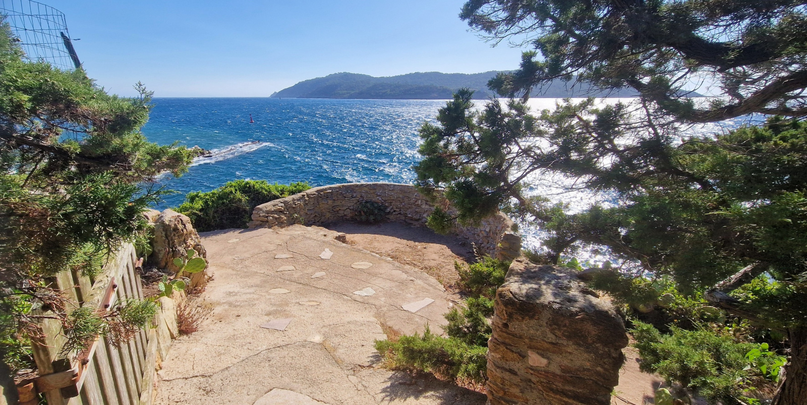 Depuis la maison, un chemin dallé traverse le jardin pour descendre à la mer. Un petit portail ouvre sur une rotonde en pierre qui domine la Grande Bleue. Encore quelques marches et vous baignez dans les calanques.