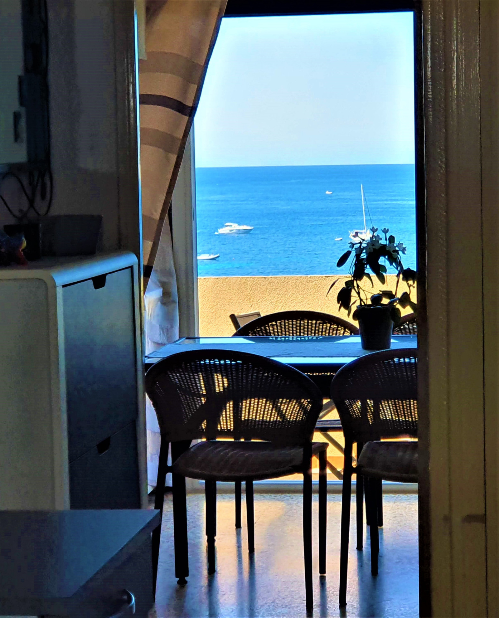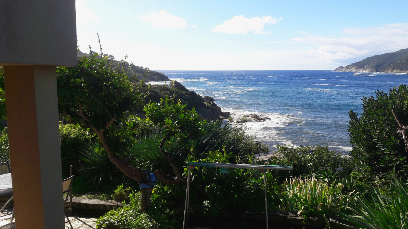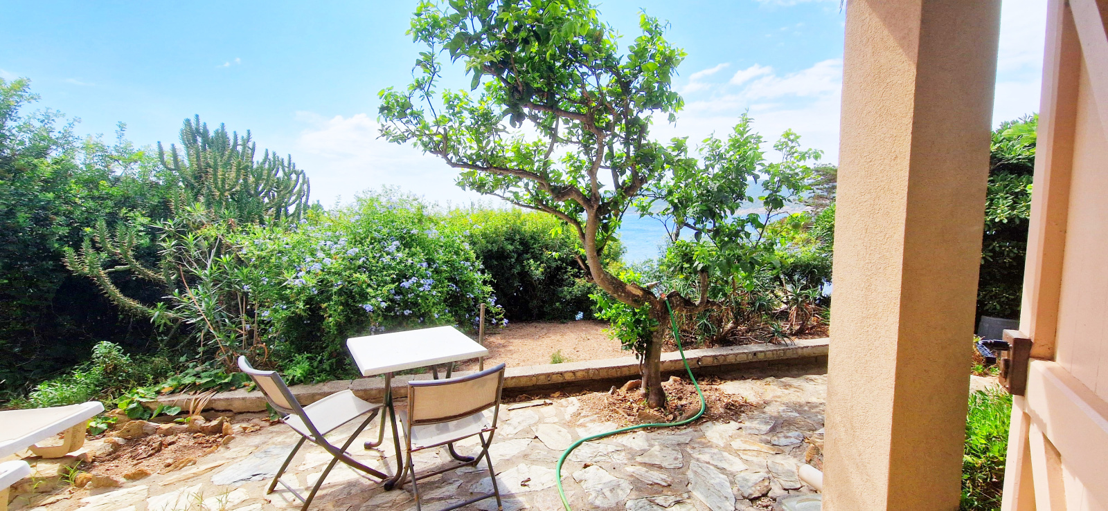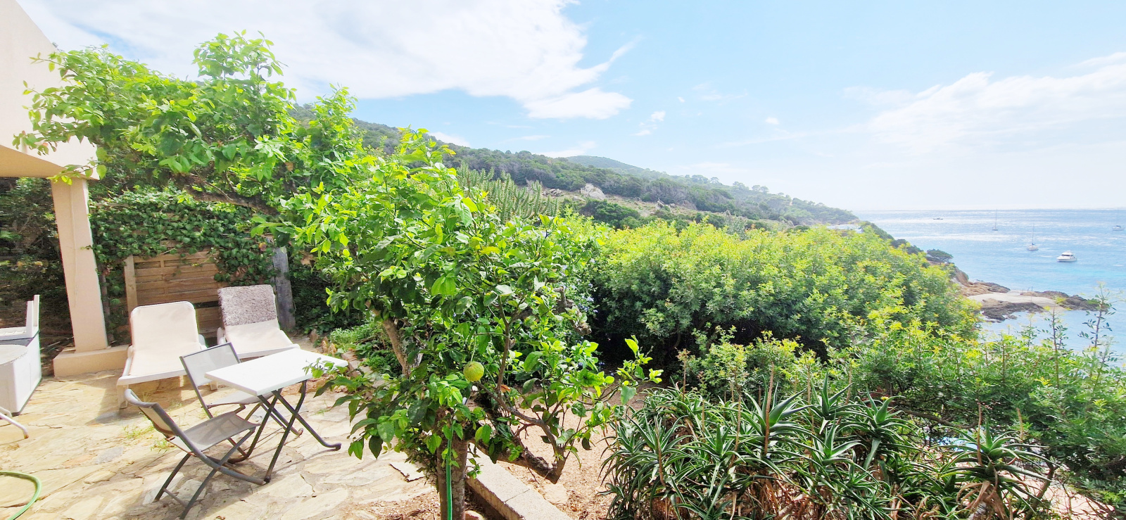 Ce jardin ouvre sur le niveau supérieur par la cuisine équipée. Le salon, en suite de la cuisine, donne sur un balcon avec une vue mer à 180 ° sur le port du Levant, sur la côte sud-ouest de l'île jusqu'à la plage, ainsi que sur le parc national de Port-Cros. Une chambre et une salle d'eau ouvrent également sur l'entrée. Un escalier extérieur permet de descendre à une seconde terrasse en bas de la maison.