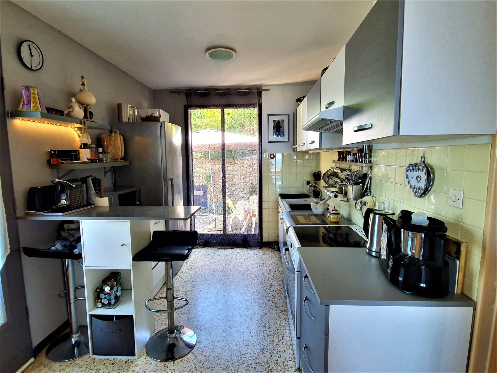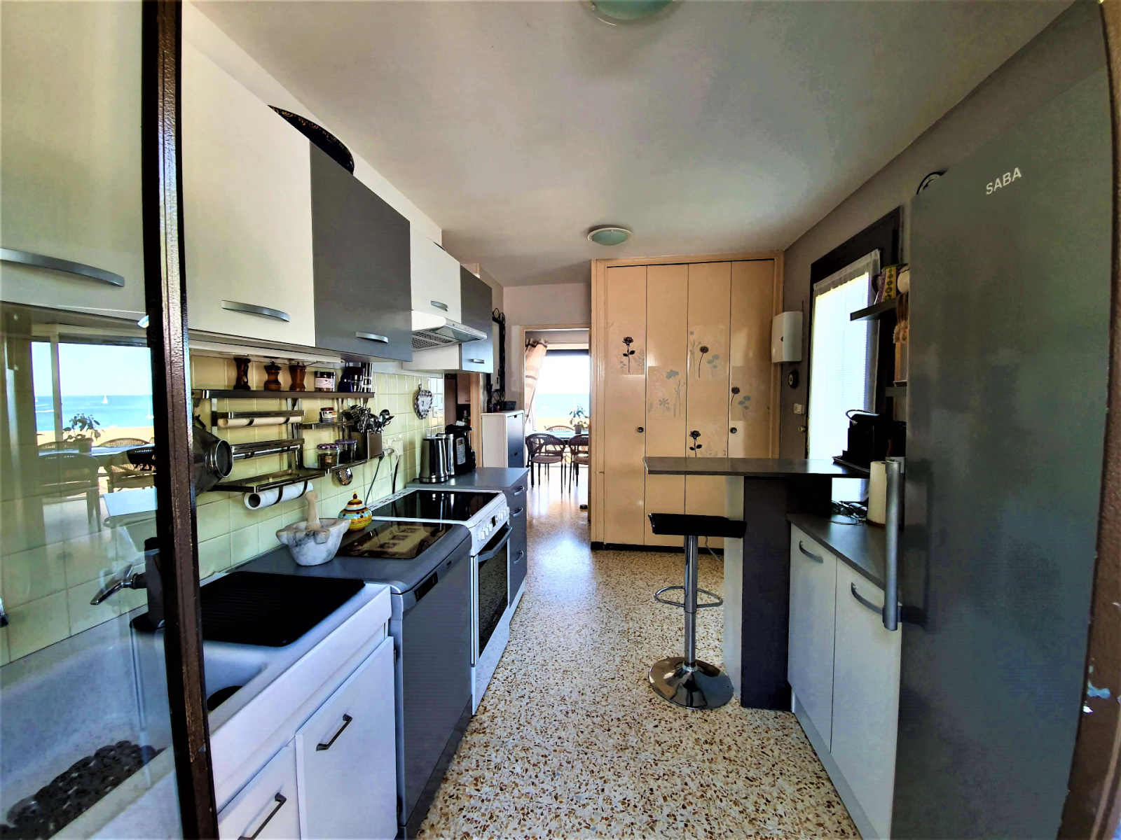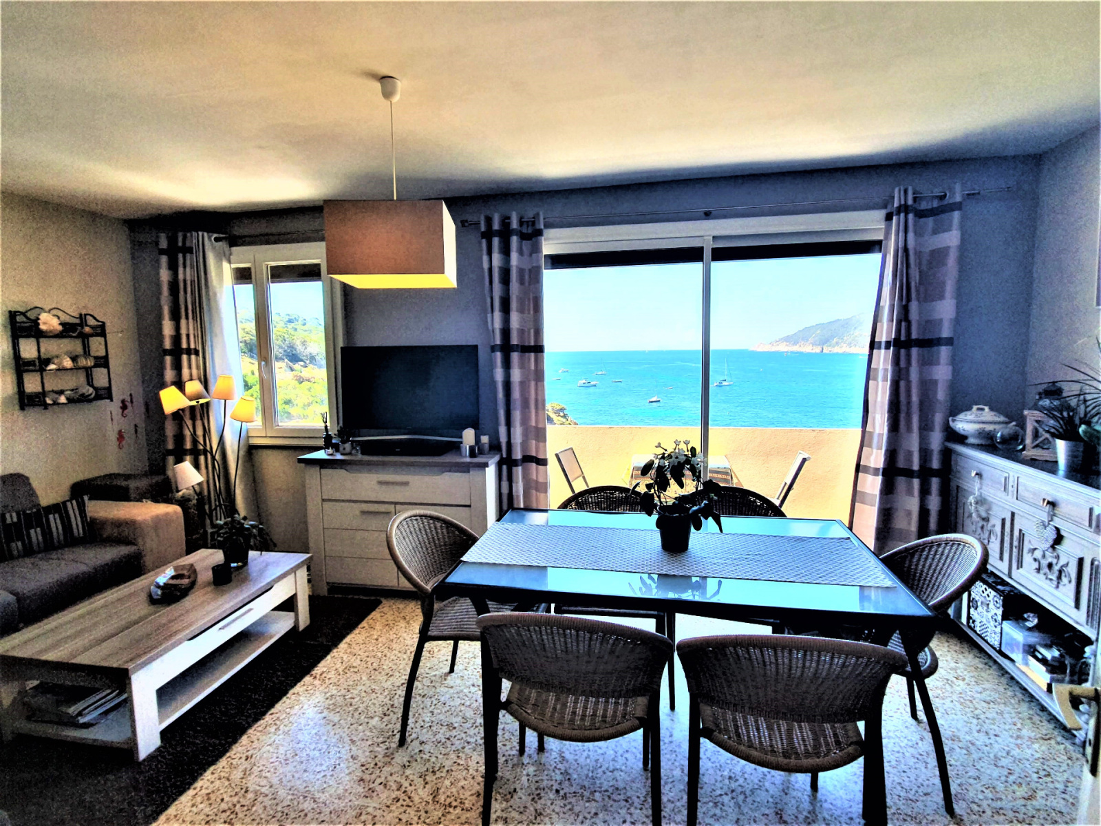 Ce jardin ouvre sur le niveau supérieur par la cuisine équipée. Le salon, en suite de la cuisine, donne sur un balcon avec une vue mer à 180 ° sur le port du Levant, sur la côte sud-ouest de l'île jusqu'à la plage, ainsi que sur le parc national de Port-Cros. Une chambre et une salle d'eau ouvrent également sur l'entrée. Un escalier extérieur permet de descendre à une seconde terrasse en bas de la maison.