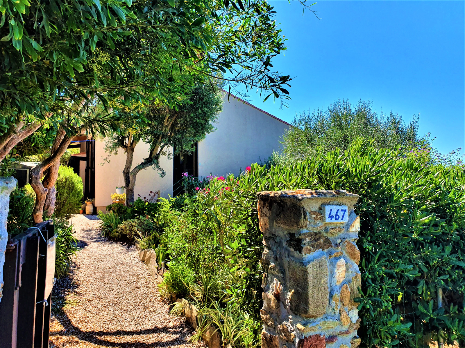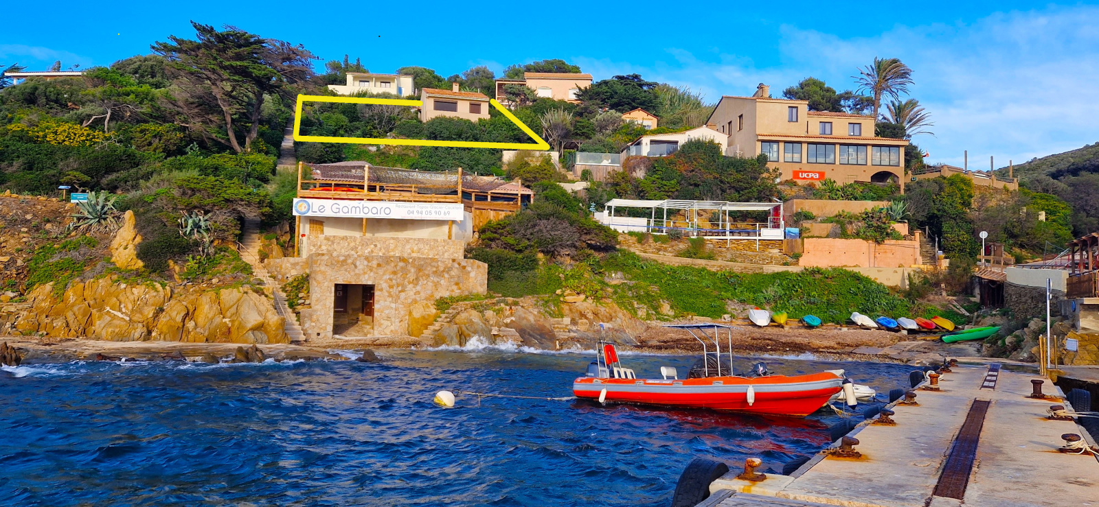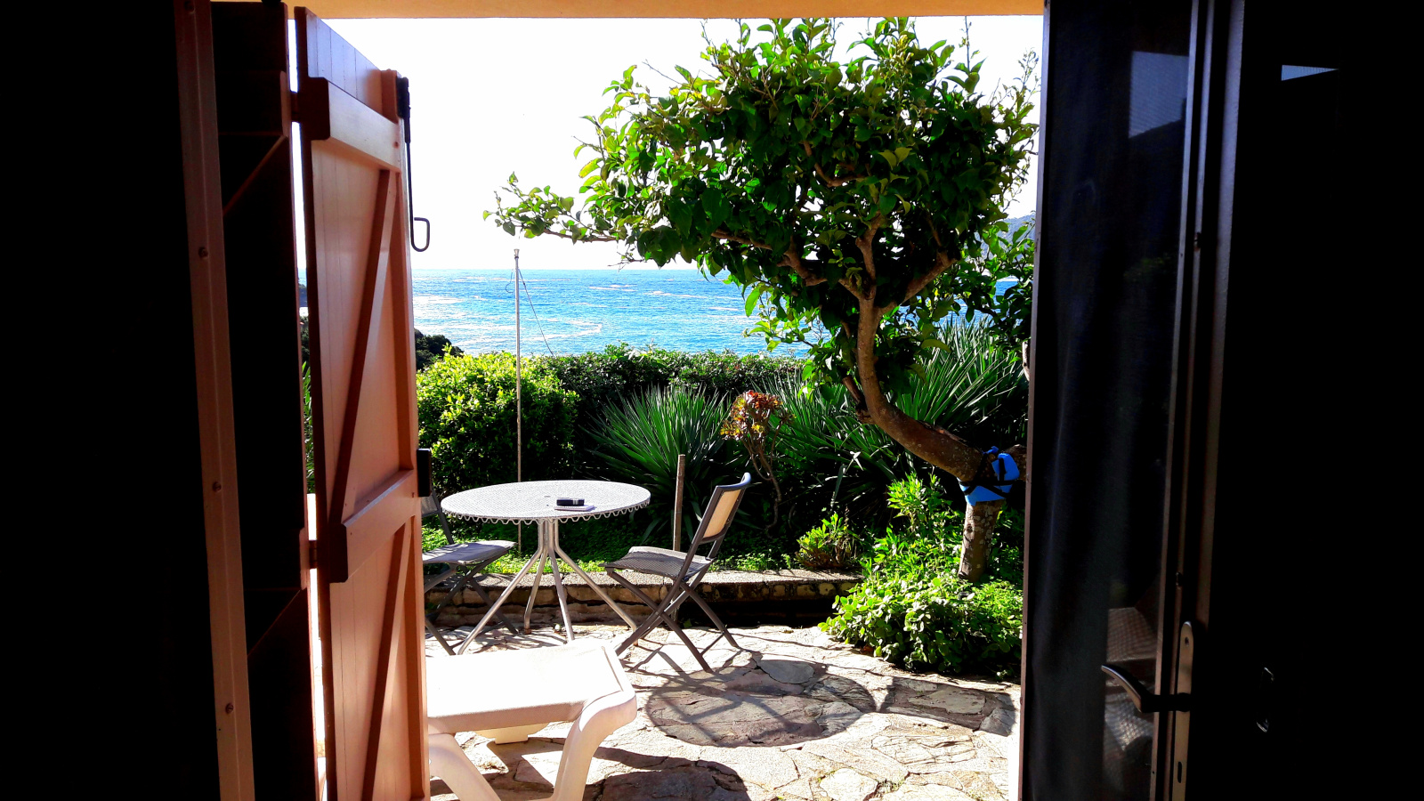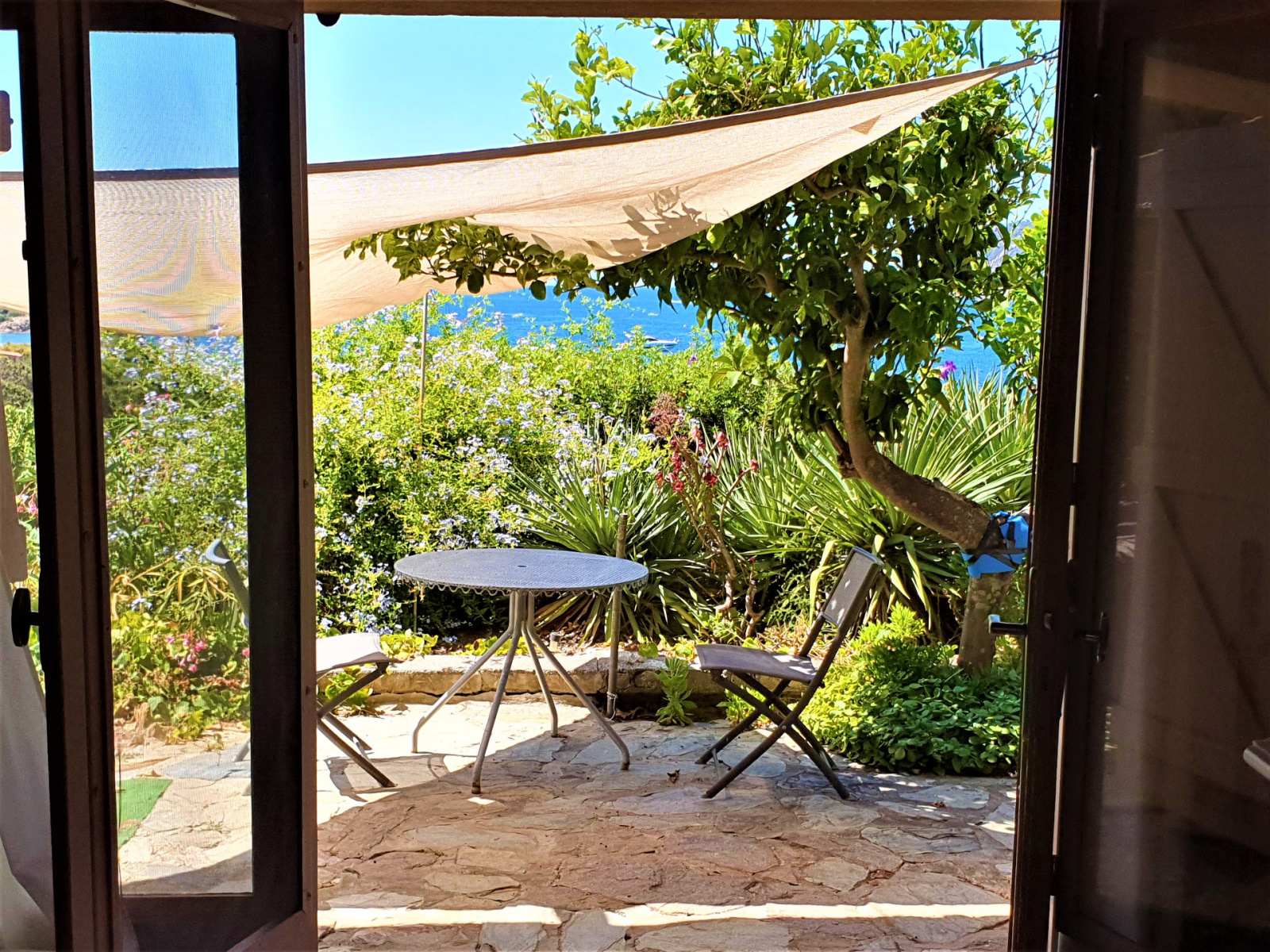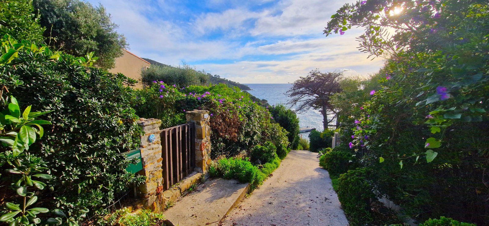 Le jardin arboré d'essences méditerranéennes a une superficie d'environ 500 m². On est juste au dessus du tout petit port de l'Ayguade du Levant, son pêcheur, et ses barques. A gauche et à droite du port, deux coins de baignade à l'eau transparente. A quelques coups de rames en kayak, le Parc National de Port-Cros offre des escapades inoubliables.