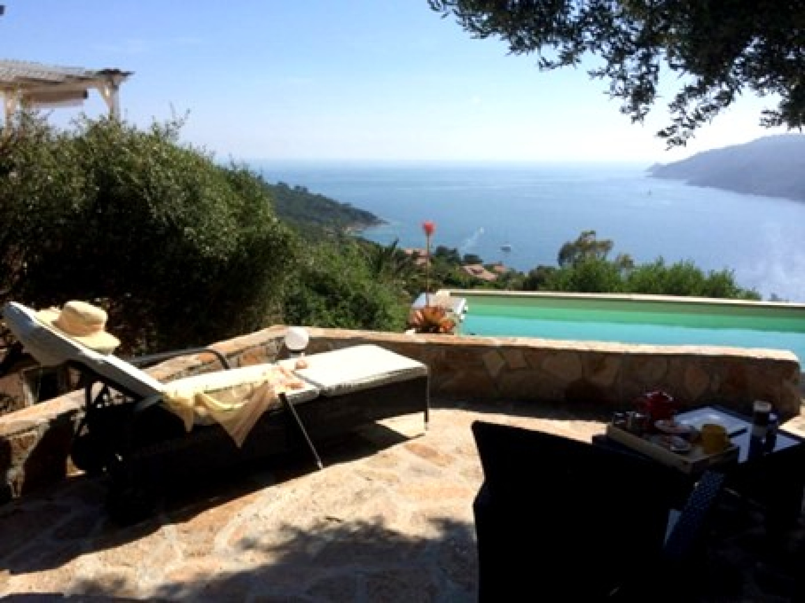 À l’extérieur : une piscine privée avec vue imprenable sur la Grande Bleue, entourée de végétation méditerranéenne pour une intimité totale dans son vaste jardin de 1317 m².