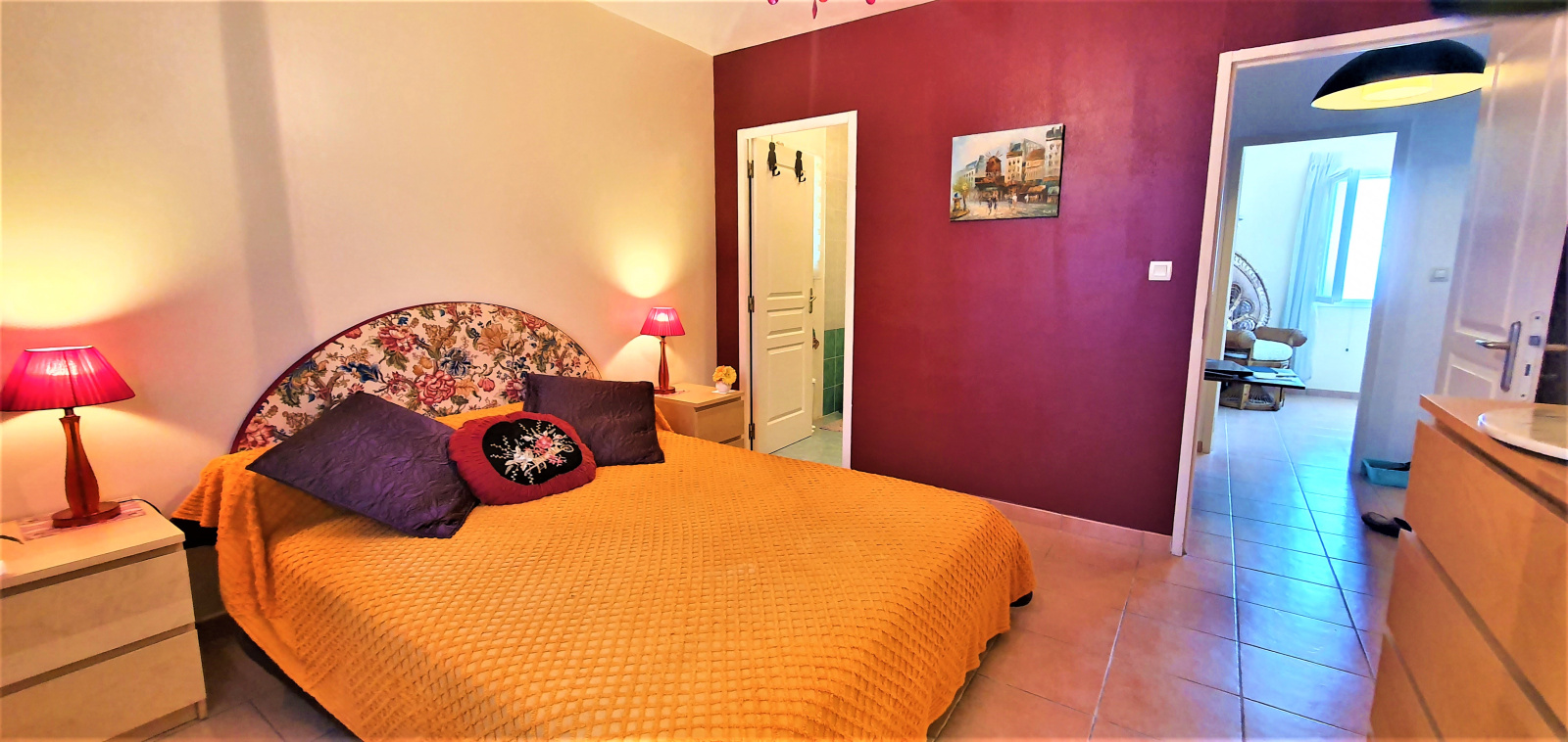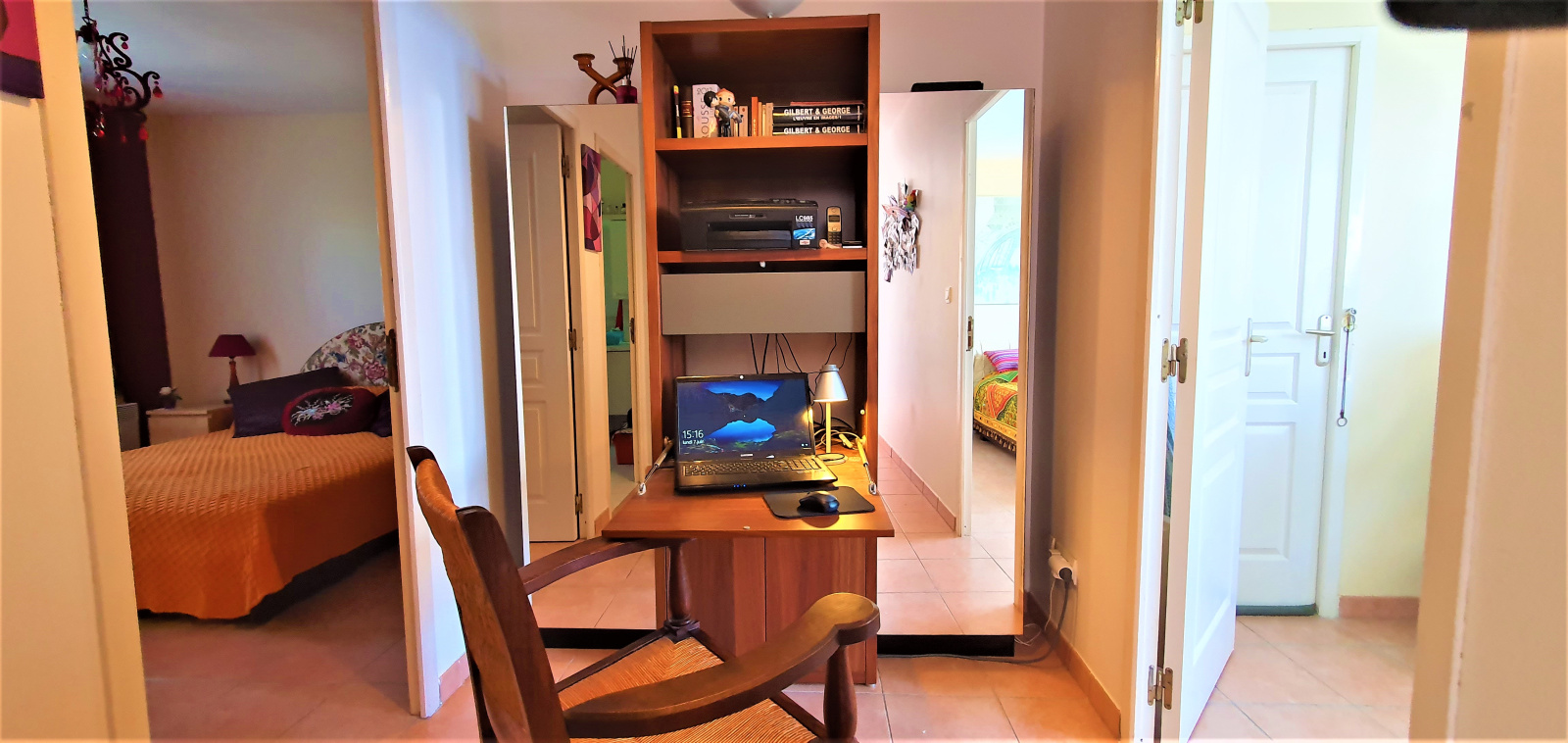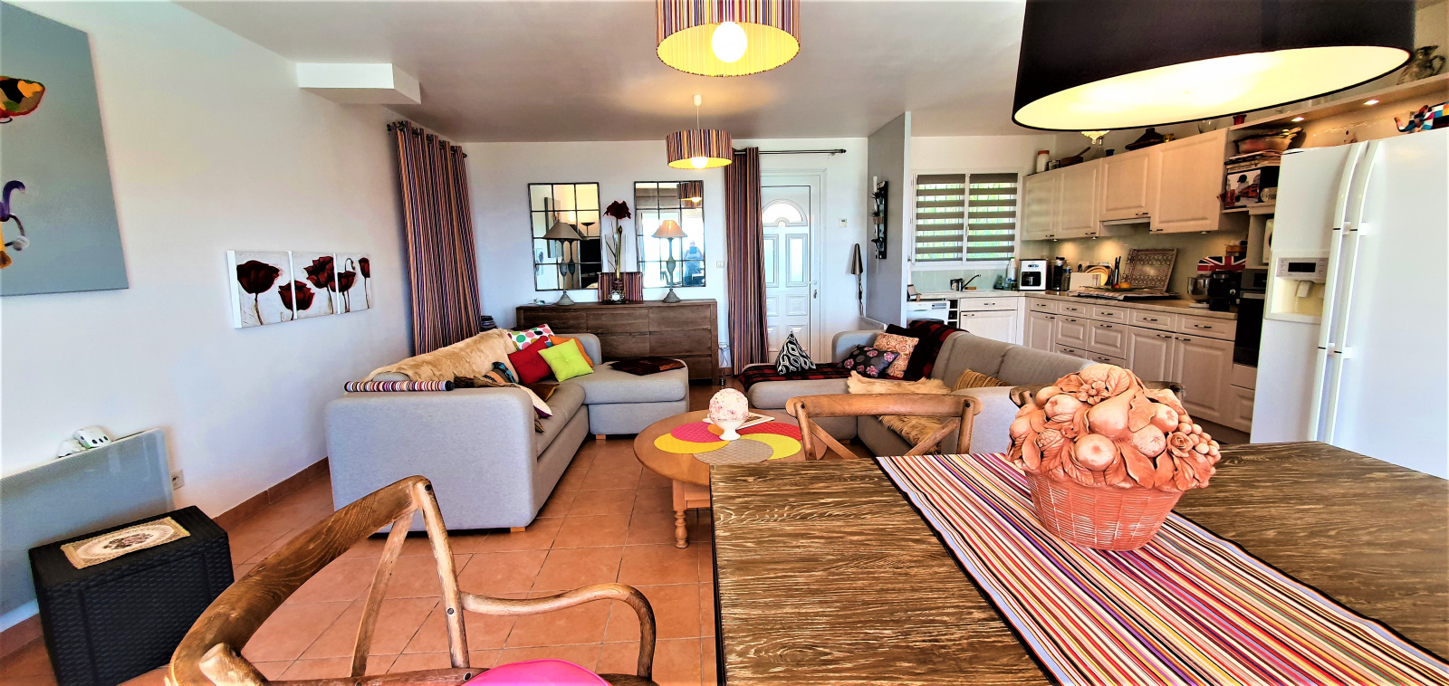 L'entrée se fait par un vaste salon/salle à manger avec une cuisine ouverte. Un dégagement, aménagé en petit bureau, permet l'accès au coin nuit, avec ses deux chambres et chacune sa salle d'eau.