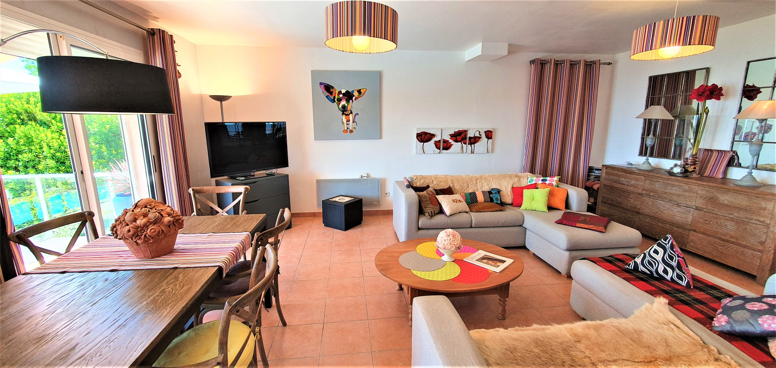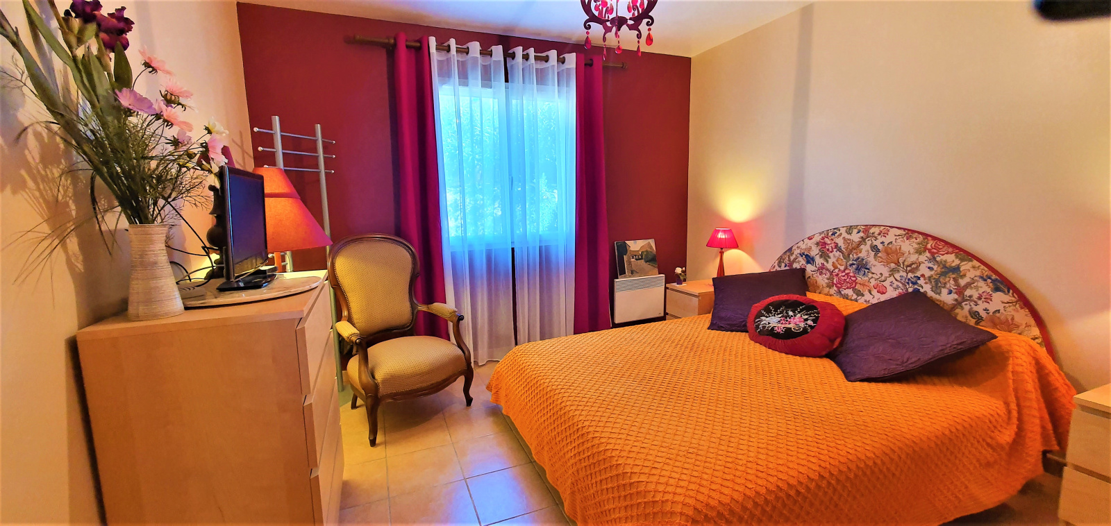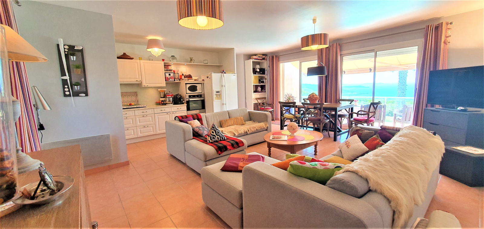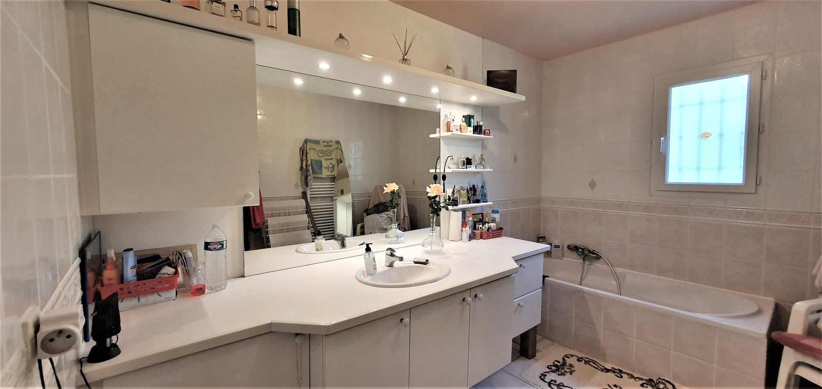 L'entrée se fait par un vaste salon/salle à manger avec une cuisine ouverte. Un dégagement, aménagé en petit bureau, permet l'accès au coin nuit, avec ses deux chambres et chacune sa salle d'eau.