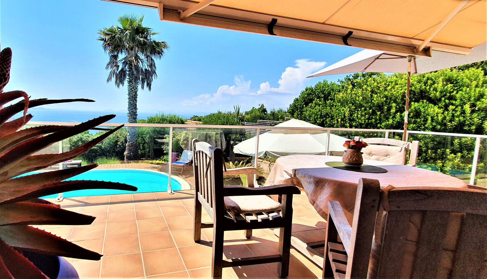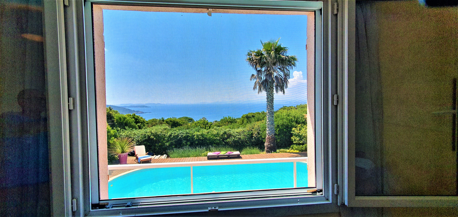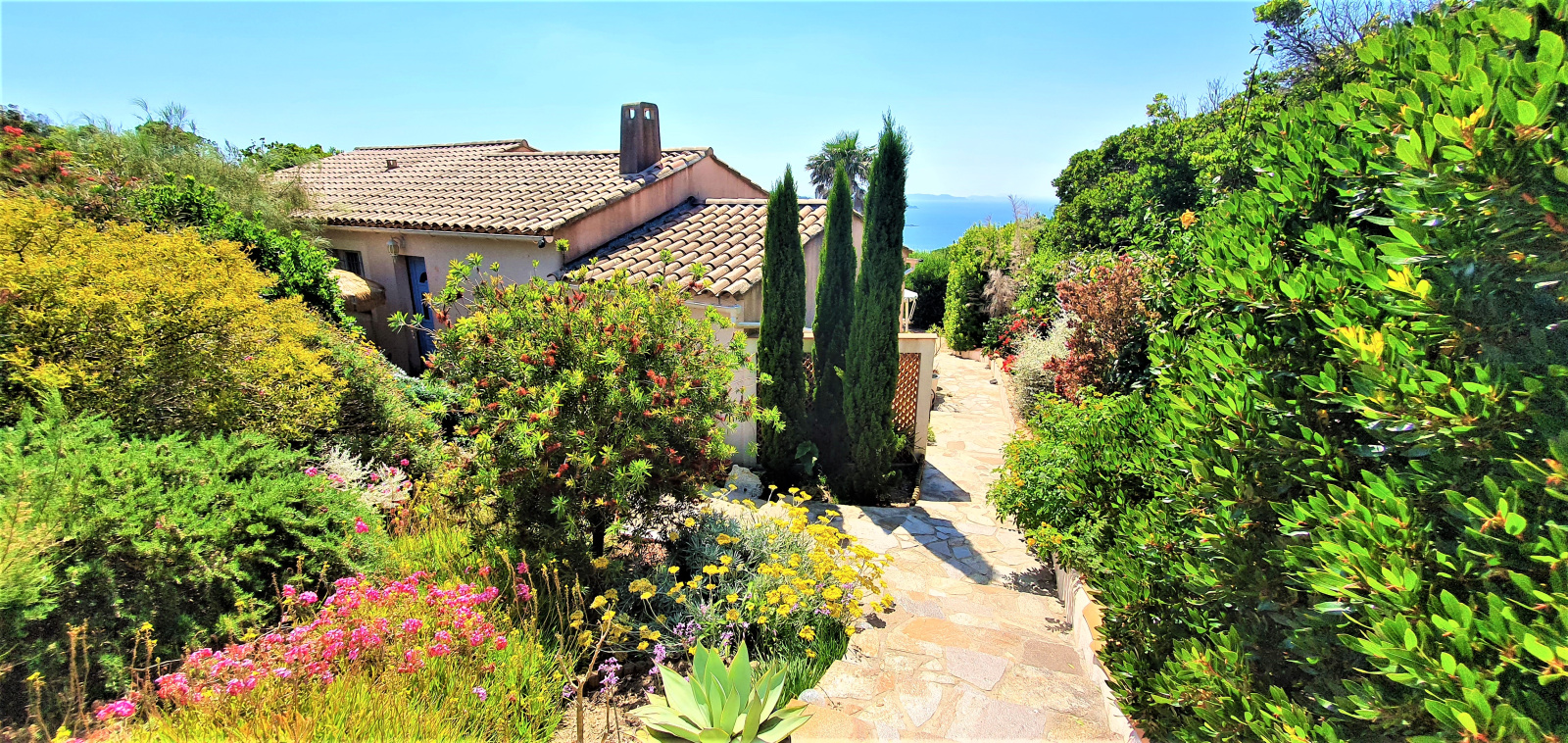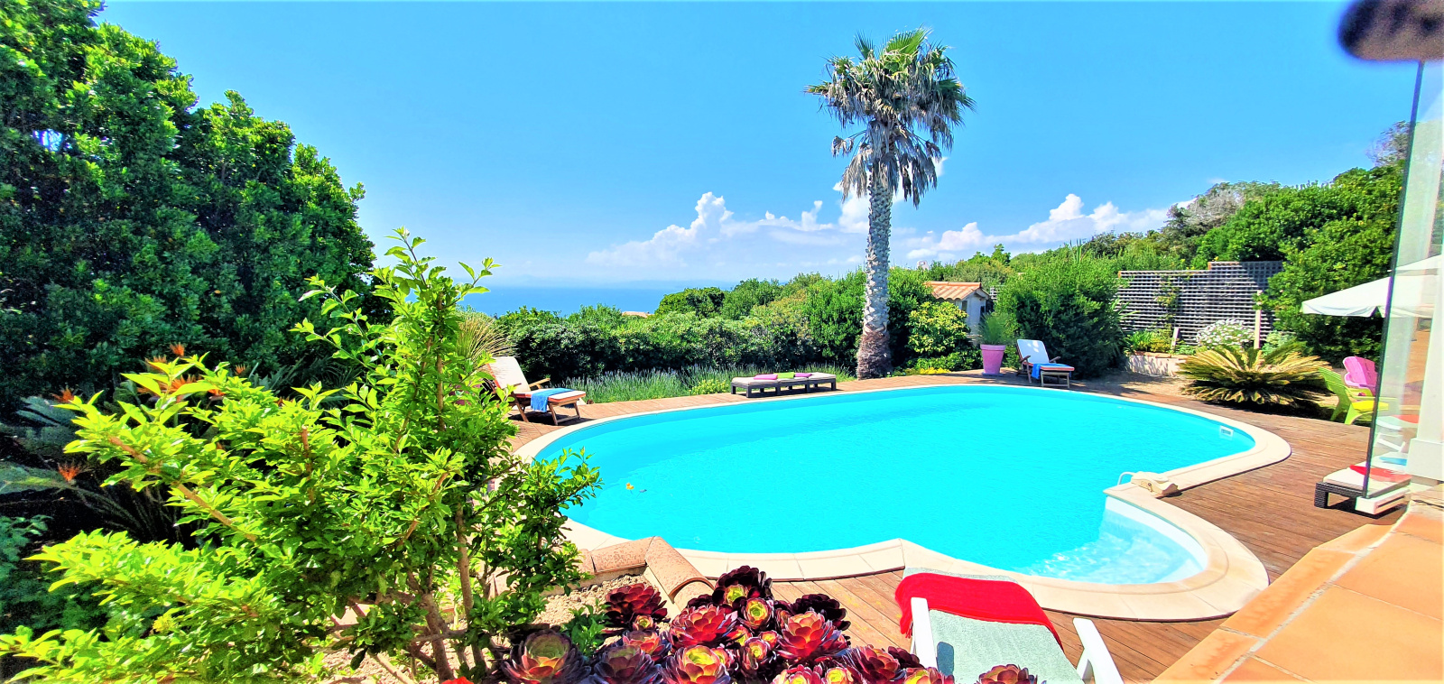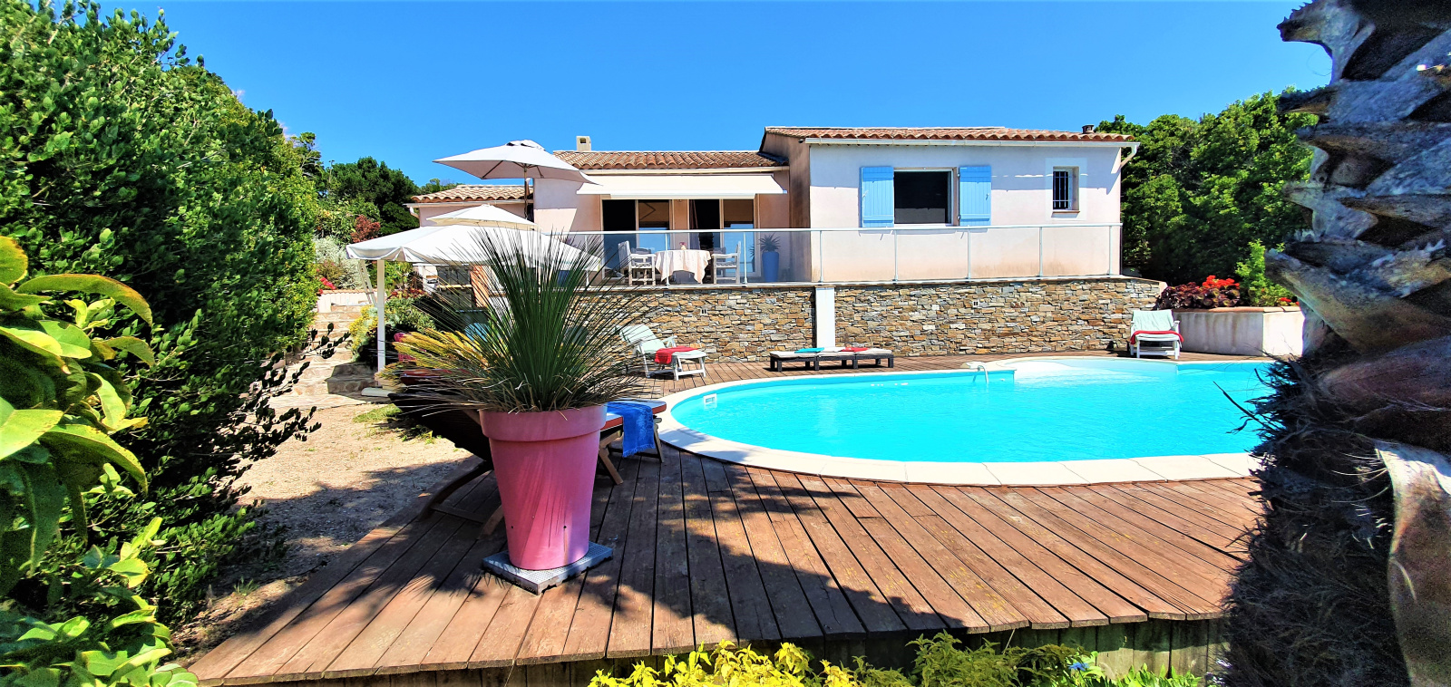 Le jardin de 1007 m² , planté d'essences méditerranéennes, est bien entretenu. Une vaste piscine et sa terrasse en bois fait face à la maison et à la mer.