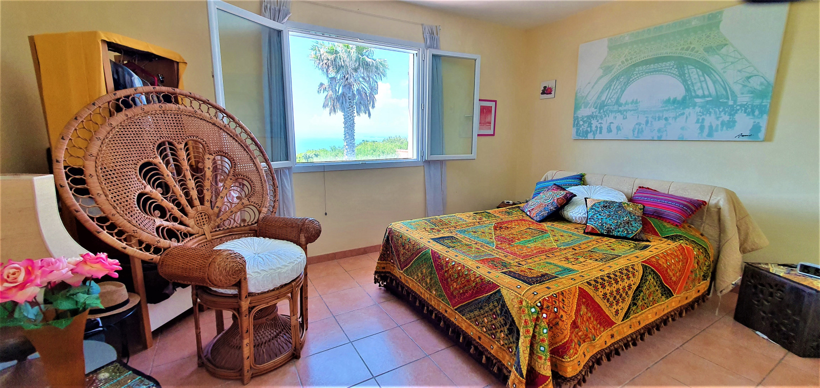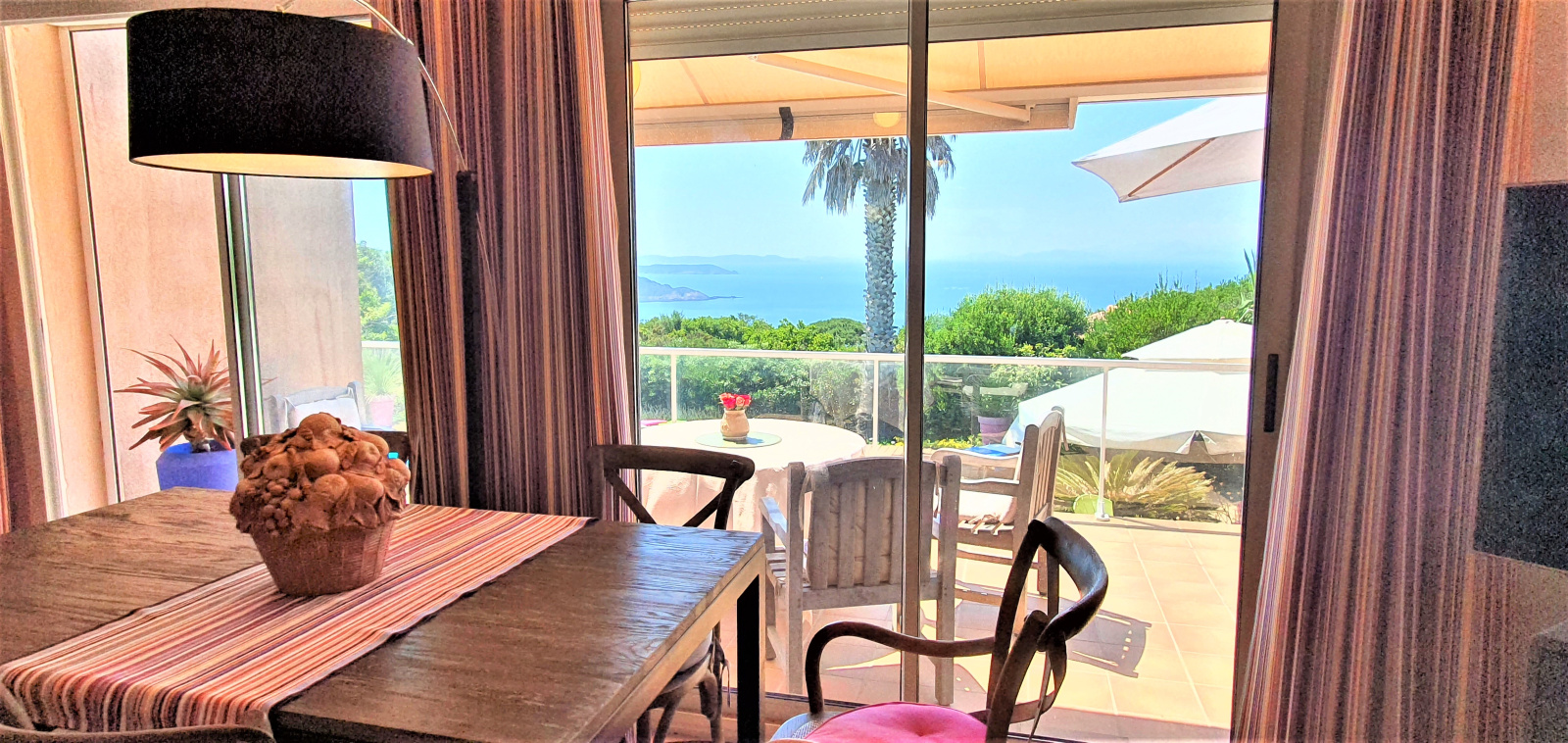 Dans le Domaine Naturiste d'Héliopolis, sur l'Ile du Levant, cette villa sur les hauteurs de l'île, face à l'ouest, domine son vallon de verdure, et au loin, la grande bleue, les îles de Port-Cros et Porquerolles. Elle fait face à l'ouest et au couchant.