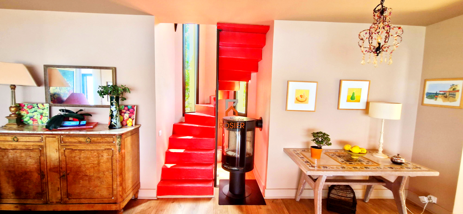 Le chauffage est électrique au sol sur le niveau principal et le niveau rez-de-jardin. Il y a également un poêle à bois.