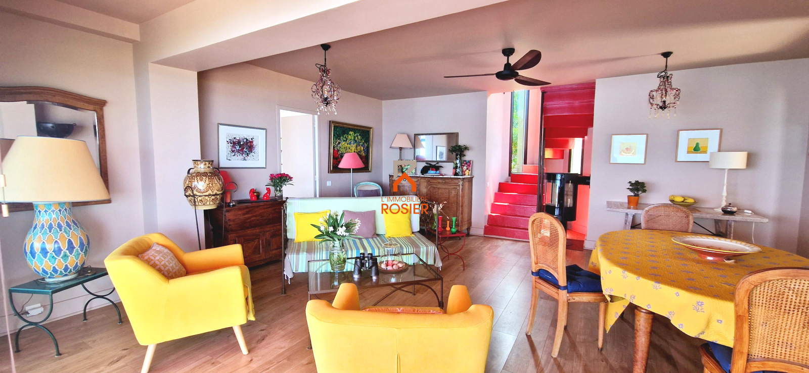 Un escalier en colimaçon donne accès au niveau supérieur composé d’une chambre ou bureau avec terrasse, et de deux pièces de rangement dans les combles de côté.